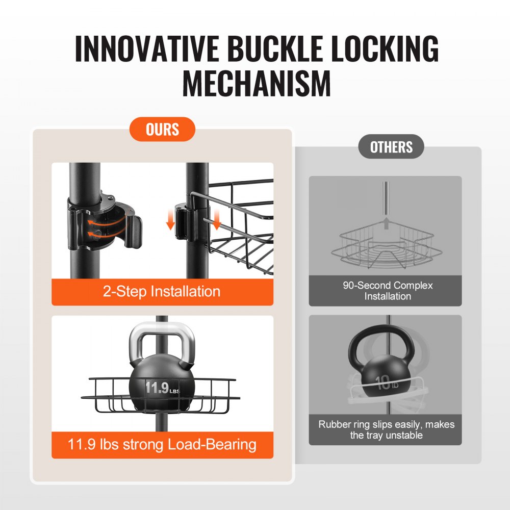 Innowacyjna konstrukcja klamry: Pręt napinający narożnej półki prysznicowej wyposażony jest w innowacyjną blokadę klamry, która upraszcza i stabilizuje proces montażu oraz skutecznie zapobiega przesuwaniu się brodzika. Wytrzymały brodzik z łatwością wytrzymuje obciążenie do 5,4 kg (11,9 funta), zapewniając bezpieczne miejsce do jego użytkowania.