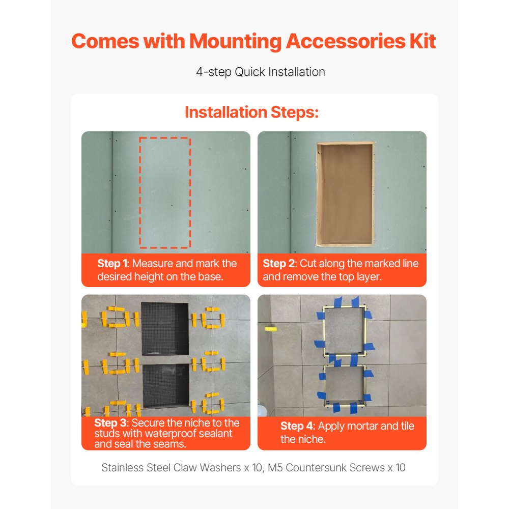 Łatwy montaż: z zestawem akcesoriów do montażu poziomego lub pionowego. Wystarczy wykonać następujące kroki: Krok 1: Określ pożądaną wysokość i narysuj poziomą linię na warstwie bazowej. Krok 2: Przetnij wzdłuż linii i usuń górną warstwę bazową. Krok 3: Przymocuj wnękę do kołków za pomocą uszczelniacza wodoodpornego i uszczelnij połączenia. Krok 4: Nałóż zaprawę i przymocuj wybrane płytki.