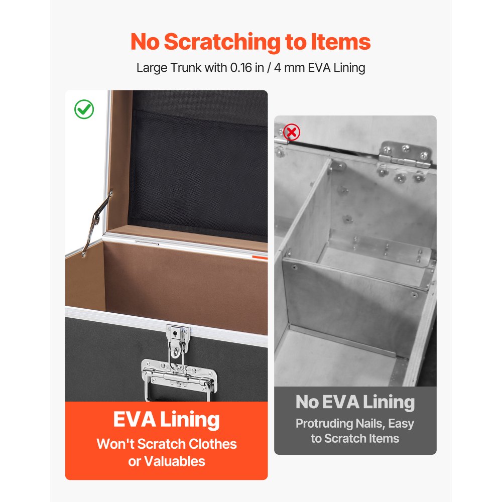Podszewka EVA z wyściółką: Duża skrzynia wyposażona jest w podszewkę EVA o grubości 4 mm (0,16 cala), która zapewnia wygodne wyściełanie i lepszą ochronę ubrań i cennych przedmiotów podczas przechowywania.