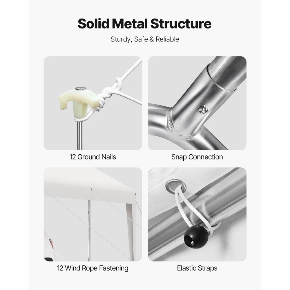 Solidne i trwałe materiały: Rama ze stali stopowej jest wykonana z ocynkowanych rur stalowych, aby zapobiec rdzewieniu. Jest bardziej wytrzymała i trwała niż konwencjonalna stal i wytrzymuje większe ciśnienie wiatru i większy ciężar. Dzięki temu wiata pozostaje stabilna i trwała. Liny wiatrowe i kołki do mocowania w ziemi zapewniają dodatkowe bezpieczeństwo w wietrznych warunkach.