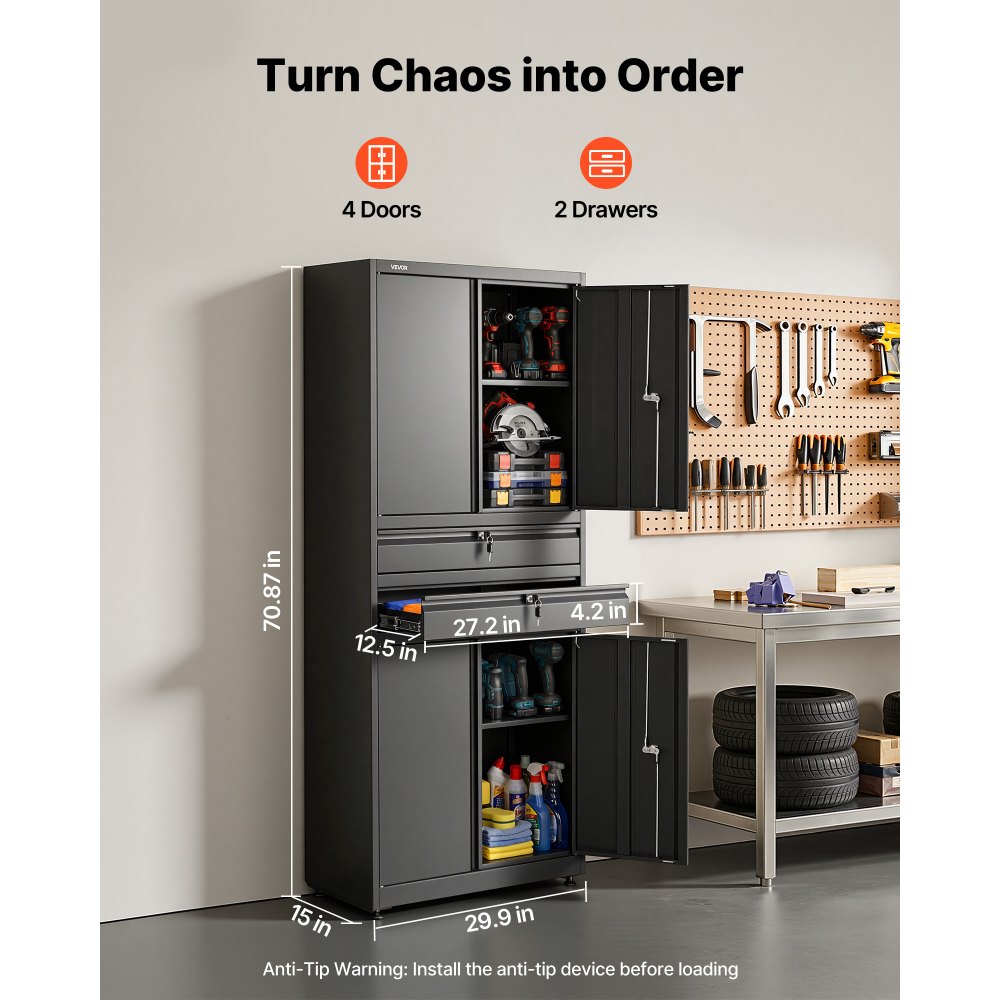Regulowane półki na każdy przedmiot: Ta szafka garażowa z regulowanymi i wyjmowanymi półkami bez użycia narzędzi pozwala na elastyczną organizację przestrzeni. Z łatwością przechowuj wysokie skrzynki narzędziowe, małe narzędzia ręczne i przedmioty o różnych rozmiarach.