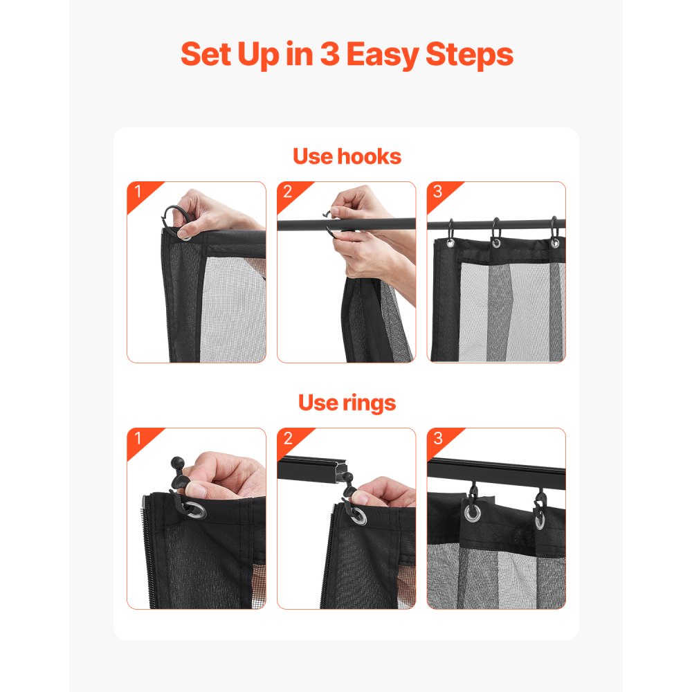 Przemyślana konstrukcja: Każda strona posiada dwustronne zamki błyskawiczne, zapewniające łatwy dostęp. Krawędzie siatki tarasowej wyposażone są w paski mocujące oraz aluminiowe oczka u góry, pośrodku i u dołu, co ułatwia zawieszanie i zapewnia wysoką odporność na rozdarcia. Oferujemy plastikowe haczyki i kółka do zawieszania, co pozwala wybrać optymalną metodę mocowania siatki do altany.