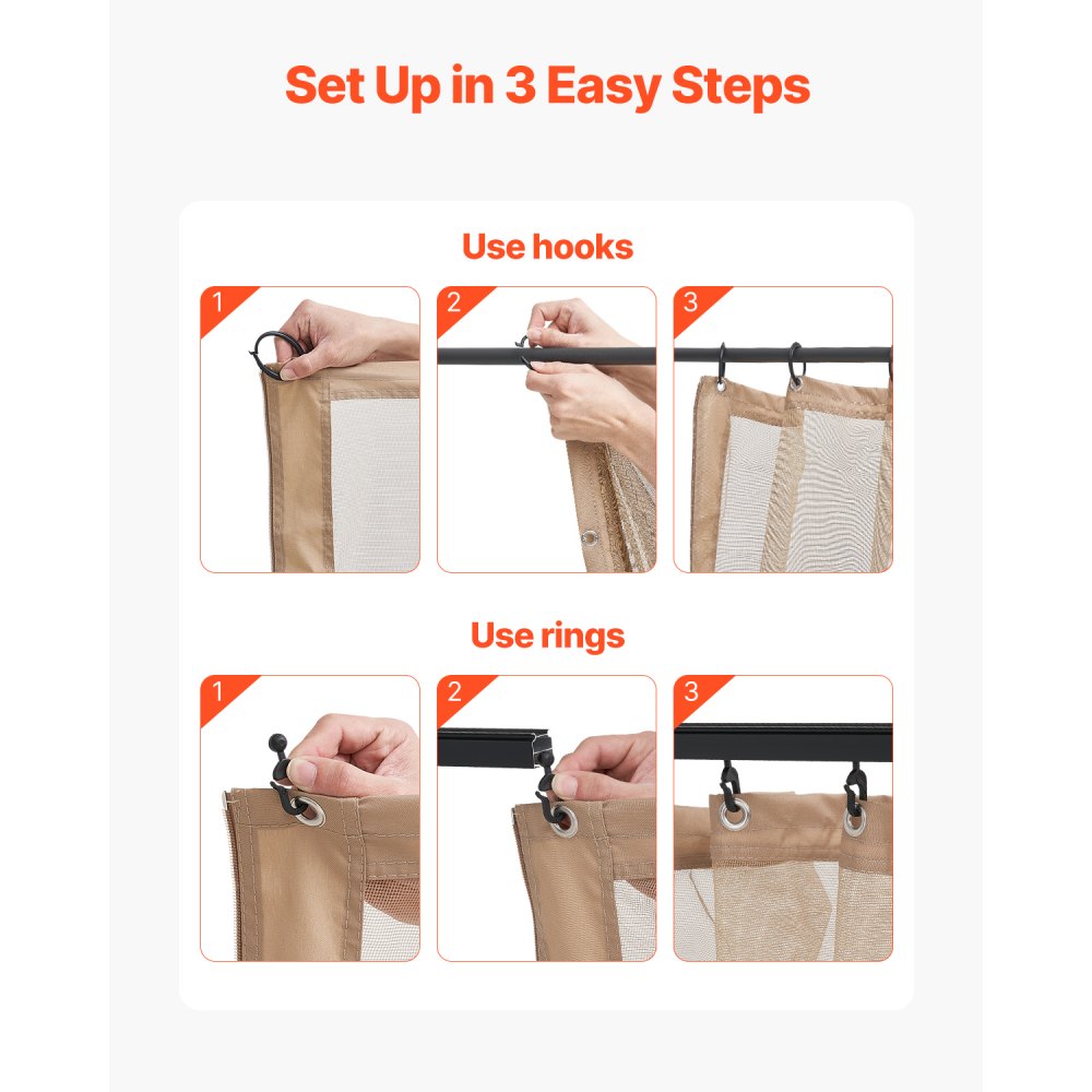 Przemyślana konstrukcja: Każda strona posiada dwustronne zamki błyskawiczne, zapewniające łatwy dostęp. Krawędzie siatki tarasowej wyposażone są w paski mocujące oraz aluminiowe oczka u góry, pośrodku i u dołu, co ułatwia zawieszanie i zapewnia wysoką odporność na rozdarcia. Oferujemy plastikowe haczyki i kółka do zawieszania, co pozwala wybrać optymalną metodę mocowania siatki do altany.