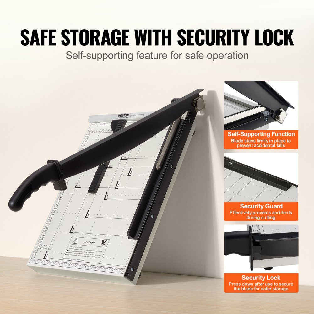Bezpieczeństwo przede wszystkim: Twoje bezpieczeństwo jest naszym priorytetem. Nasza gilotyna do papieru wyposażona jest w samonośne ostrze zapewniające bezpieczne i stabilne cięcie. Jest również wyposażona w szynę ochronną i blokadę ostrza, co zapewnia pełen spokój ducha podczas użytkowania i przechowywania.