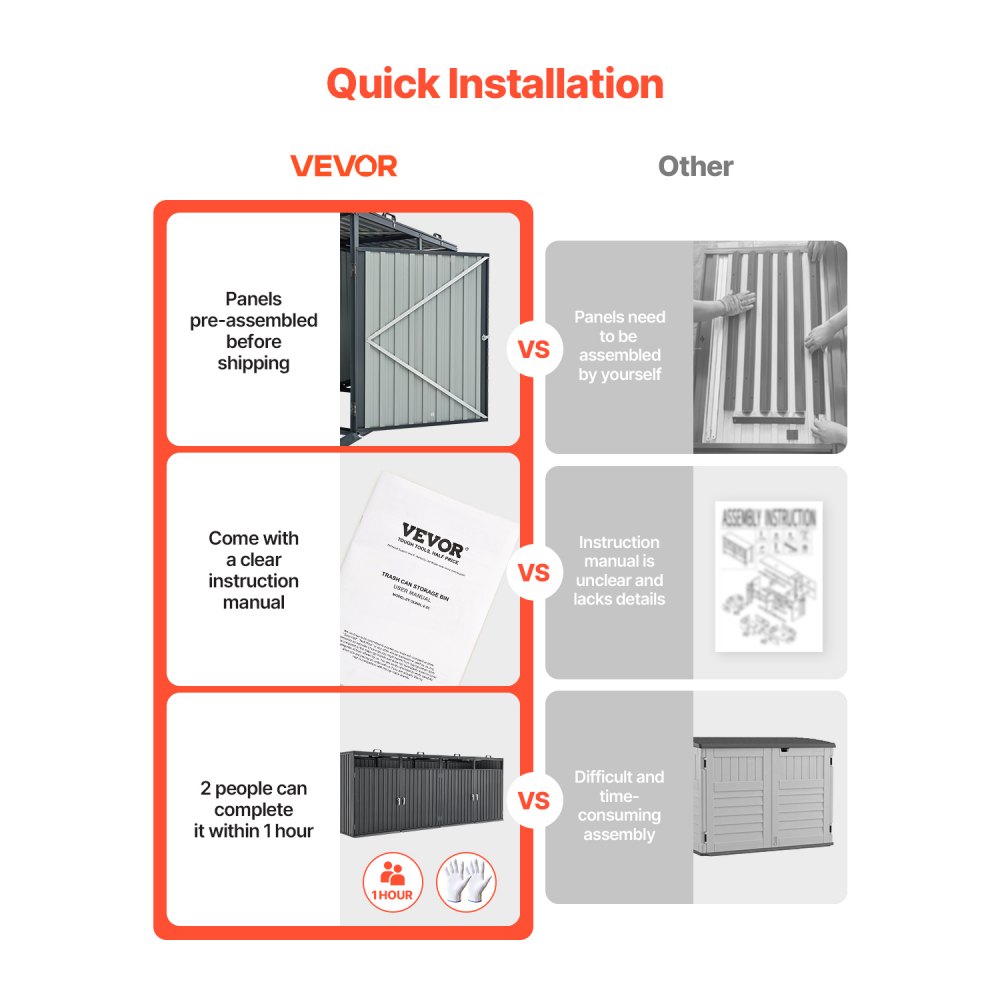 Łatwy i szybki montaż: Panele naszej metalowej szopy na śmieci są wstępnie zmontowane, co ułatwia wysyłkę i upraszcza proces montażu. Dwie osoby mogą szybko wykonać instalację, a w zestawie znajdują się również dwie pary rękawic ochronnych chroniących dłonie instalatorów