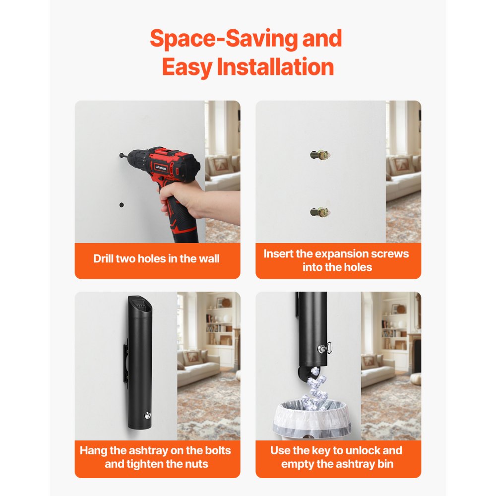 Łatwe czyszczenie: Wystarczy otworzyć dolną pokrywę kluczykiem, aby łatwo opróżnić niedopałki i popiół. Metalowa powierzchnia popielniczki zewnętrznej jest również łatwa w czyszczeniu – wystarczy ją przetrzeć lub opłukać, aby szybko wyczyścić.