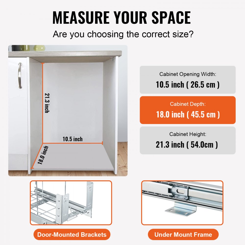 Montaż w kilka minut: Dzięki dołączonym otworom montażowym i zestawowi śrub, wysuwany kosz na śmieci można łatwo zamontować na szafkach dolnych. Uchwyty montowane na drzwiach umożliwiają otwieranie kosza jedną ręką po montażu. Zaleca się, aby szerokość otworu wynosiła ≥ 50 cm (19,7 cala), głębokość szafki ≥ 29,97 cm (11,8 cala), a wysokość szafki ≥ 67,06 cm (26,4 cala). Po zmierzeniu szafki, kosz można zmontować w kilka minut. Gotowy do napełnienia nowego kosza na śmieci?