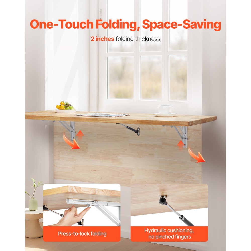 Konstrukcja zajmująca mało miejsca: to biurko montowane na ścianie zostało zaprojektowane tak, aby oszczędzać miejsce i można je szybko składać i rozkładać. Idealnie nadaje się do małych pomieszczeń. Hydrauliczne, wolno zamykające się wsporniki sprawiają, że jest niezwykle wygodny do natychmiastowego użycia, bez konieczności tworzenia dużych zarezerwowanych miejsc - wystarczy rozłożyć i rozpocząć pracę lub eksponowanie przedmiotów.