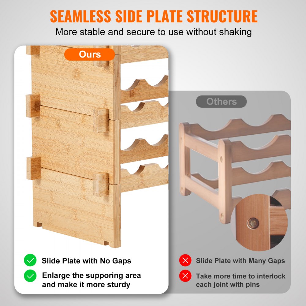 Stabilne siedzisko na butelki: Pomieści butelki wina standardowej wielkości (750 ml), takie jak Bordeaux i szampan. Ten bambusowy stojak na wino pomieści 90% wszystkich rozmiarów butelek dostępnych na rynku. Wysokość między półkami została zwiększona do 95 mm (3,7 cala), co pozwala na łatwy dostęp do ulubionych butelek.