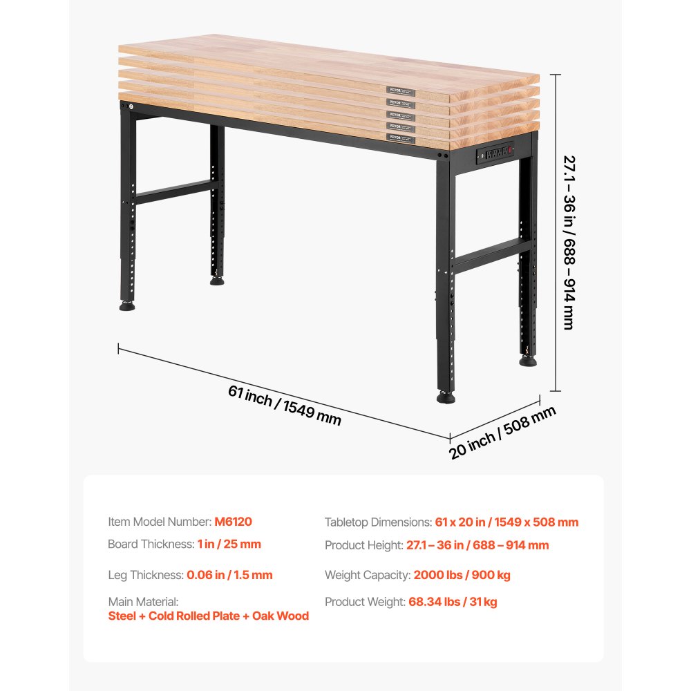 Stół warsztatowy VEVOR, 1549 x 508 mm, regulowana wysokość 688-914 mm, udźwig 900 kg, zawiera przyłącza elektryczne, powierzchnia z twardego drewna, metalowa rama i podkładki pod stopy, idealny do garażu, biura i domu