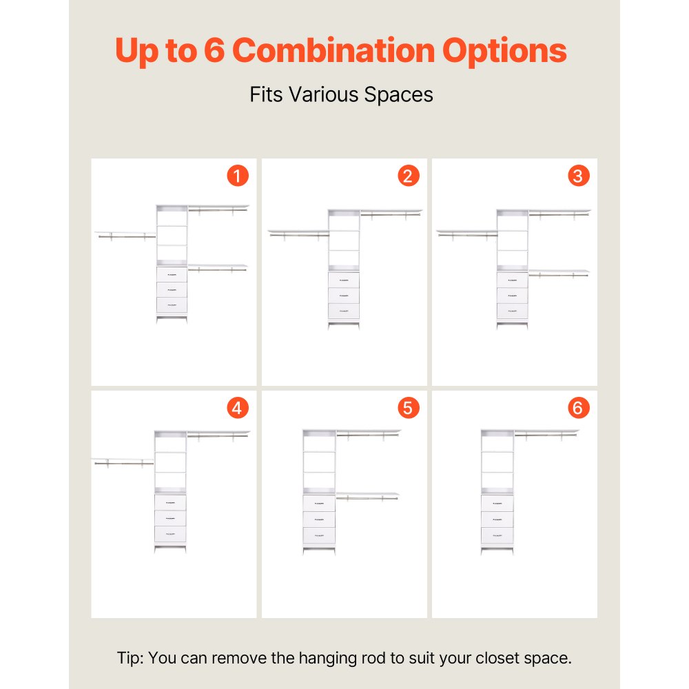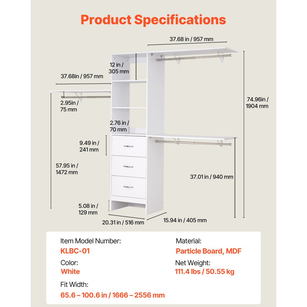 Regulowana konstrukcja: drążek na ubrania można regulować w zakresie od 575 do 1020 mm (22,6 do 40,2 cala), a półki oferują 5 poziomów wysokości co 32 mm (1,3 cala). W zestawie 3 szuflady zapewniające wszechstronne przechowywanie.