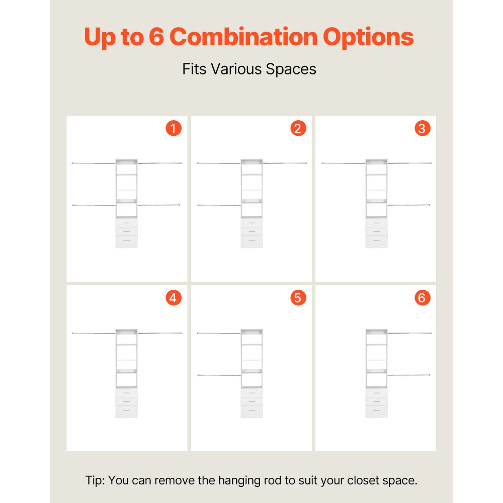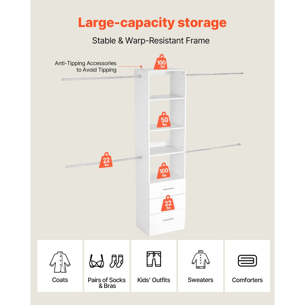 Regulowana konstrukcja: drążek na ubrania można regulować w zakresie od 22,6 do 40,2 cala (575–1020 mm), a półki oferują pięć poziomów wysokości co 1,3 cala (32 mm). Trzy szuflady zapewniają wszechstronne miejsce do przechowywania.