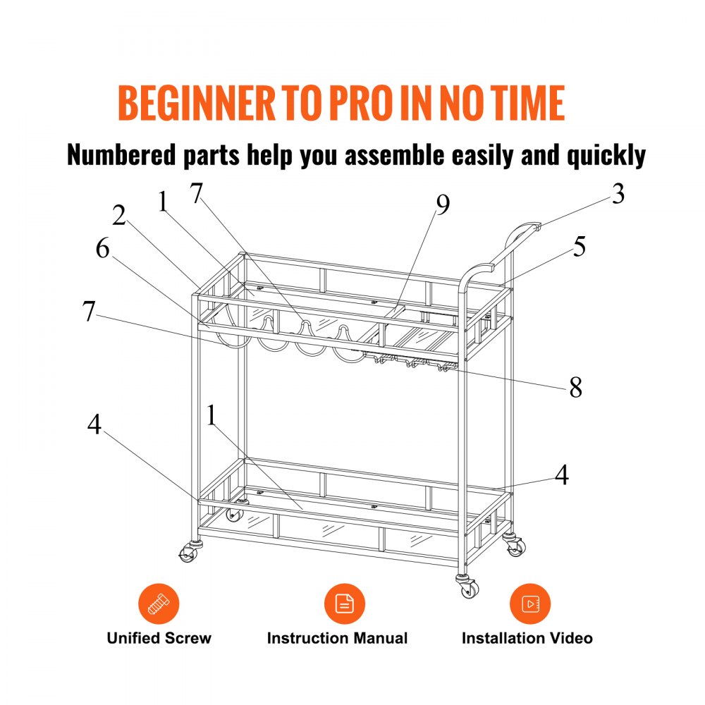 Łatwy w montażu: wózek do serwowania jest wyposażony we wszystkie niezbędne akcesoria i szczegółową instrukcję montażu. W zestawie znajdują się standardowe śruby i przejrzysta, skrócona instrukcja. Wszystkie części są ponumerowane, a każdy etap montażu jest wyraźnie przedstawiony. Możesz łatwo zrozumieć strukturę i marnować niewiele czasu i energii. Przygotuj swoje ulubione wina i dania!