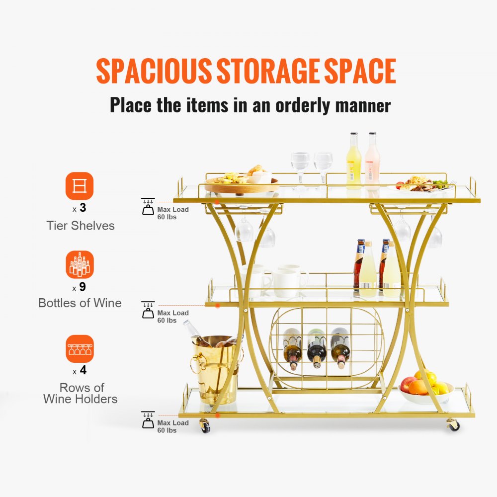 Wózek barowy VEVOR z 3 poziomami, wózek na wino o udźwigu 82 kg, mobilny wózek na napoje, szklane półki z lustrem, 111 x 35 x 92,5 cm, do małych przestrzeni, kuchni, jadalni, baru, złoty - Sprzęt do magazynowania i obsługi