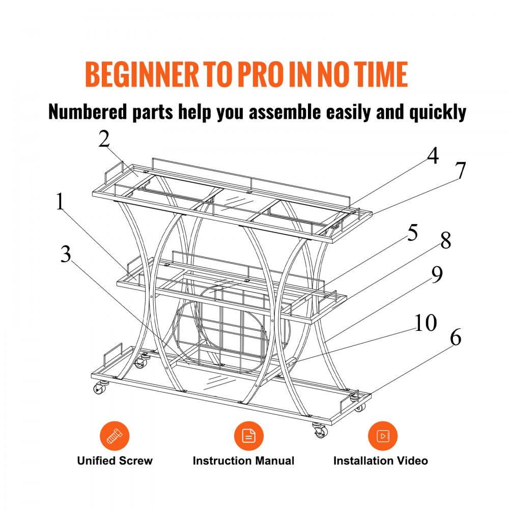 Bezproblemowy montaż: Wózek do serwowania jest dostarczany ze wszystkimi niezbędnymi akcesoriami i szczegółową instrukcją. W zestawie znajdują się standardowe śruby i przejrzysta instrukcja szybkiego startu. Wszystkie części są ponumerowane, a każdy etap montażu jest wyraźnie zilustrowany. Możesz łatwo śledzić proces montażu, oszczędzając czas i wysiłek. Przygotuj swoje ulubione wina i dania!