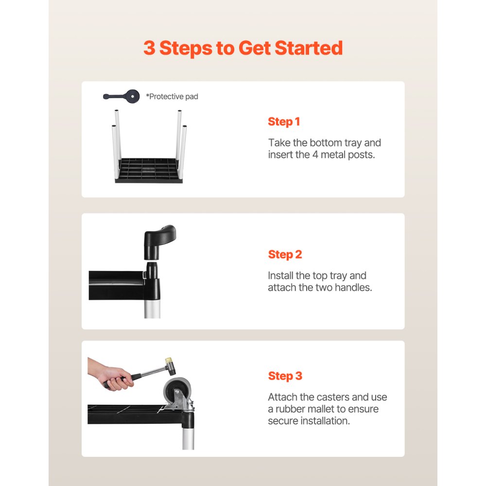 Szybki montaż: Dzięki czytelnej instrukcji, montaż wózka jest szybki i łatwy, co sprawia, że idealnie nadaje się on do użytku w garażu, biurze lub w domu do porządkowania i transportowania przedmiotów.