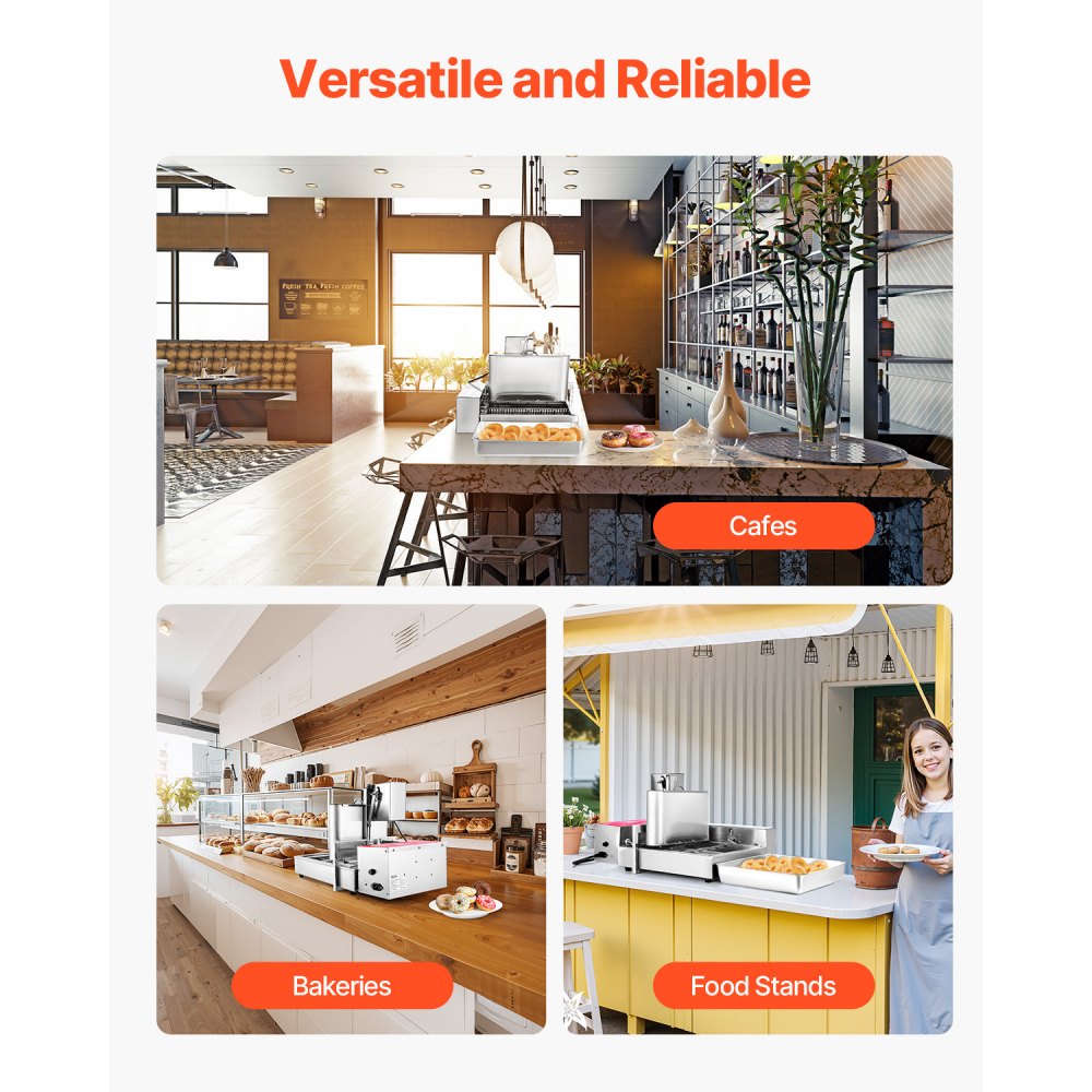 Wszechstronne zastosowanie: Niezależnie od tego, czy prowadzisz kawiarnię, piekarnię czy punkt gastronomiczny, ta stalowa maszyna do robienia pączków zaspokoi potrzeby każdej firmy i pomoże Ci szybko i sprawnie dostarczać świeże, pyszne pączki.