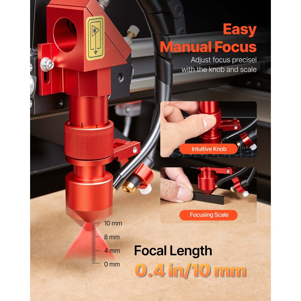 Łatwe ręczne ustawianie ostrości: Dzięki precyzyjnemu pokrętłu, czerwonemu punktowi i skali ostrości, ostrość można regulować bez wysiłku. Ten grawer laserowy CO2 zapewnia pełną kontrolę i niezawodną precyzję w każdej sytuacji.