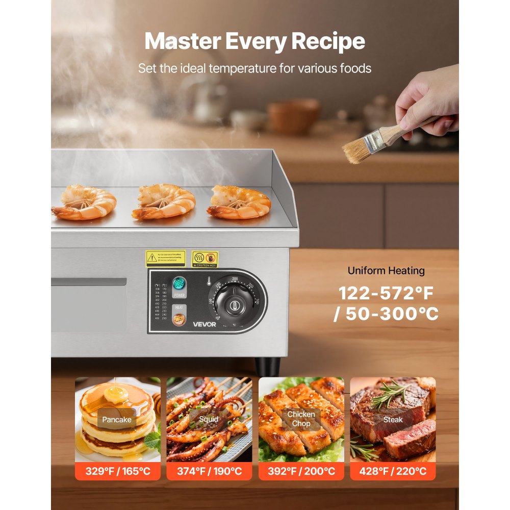Do różnorodnych potraw i okazji: Ten profesjonalny grill idealnie nadaje się do użytku prywatnego lub komercyjnego, np. w restauracjach, sklepach i punktach gastronomicznych. Nadaje się do naleśników, bekonu, sera, omletów, pizzy, steków i burgerów.