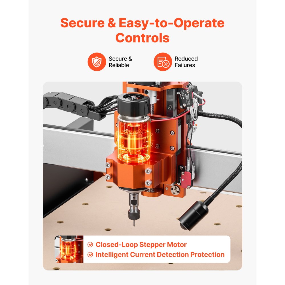 Bezpieczna i solidna konstrukcja: Wyposażona w silnik krokowy NEMA23-76 z zamkniętą pętlą, ta frezarka CNC do drewna zapewnia płynną i cichą pracę (≤75 dB). Wrzeciono posiada zabezpieczenie nadprądowe, które wydłuża jego żywotność do 5000 godzin i zwiększa bezpieczeństwo.