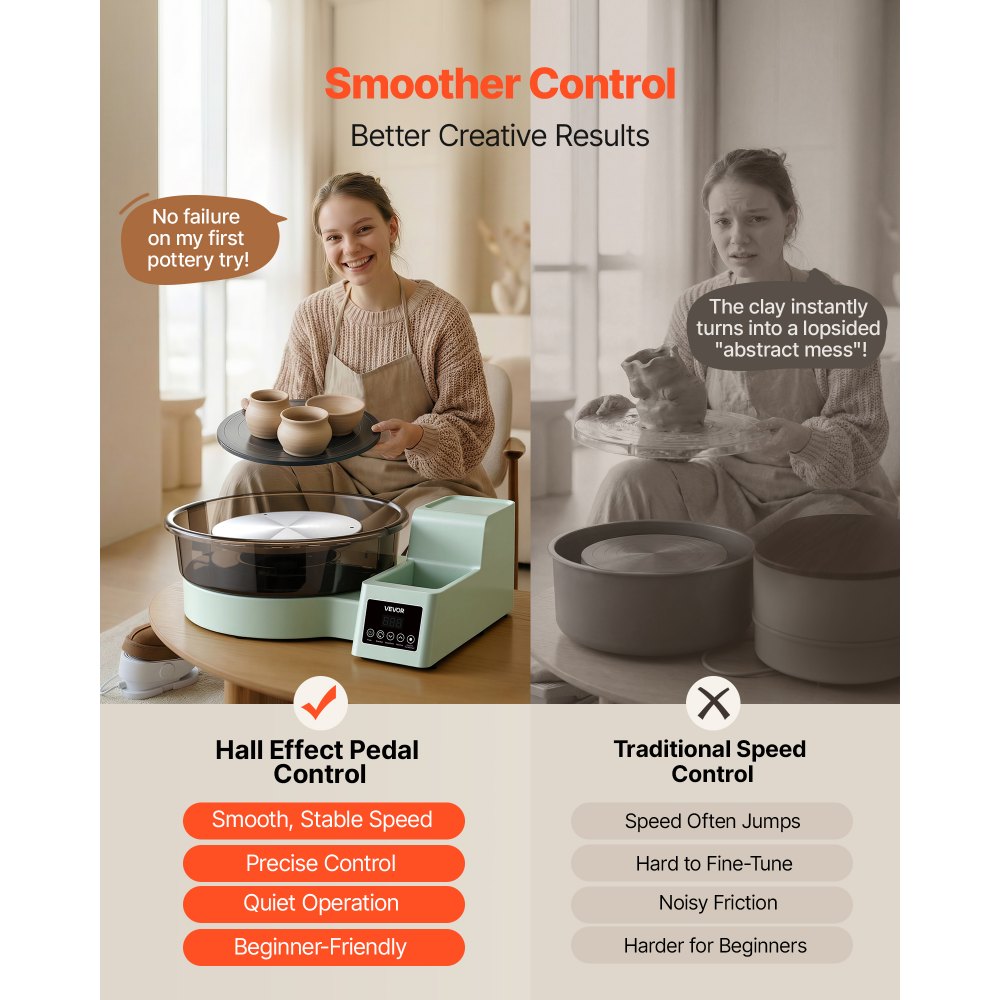 Przestronny i solidny blat roboczy: To koło garncarskie jest idealne dla ambitnych początkujących i oferuje dużo miejsca do formowania dzięki obrotowym stołom o średnicy 28/36 cm (11 cali i 14 cali). Mocny silnik o mocy 450 W zapewnia stałą wydajność i przetwarza do 5 kg gliny, zapewniając czyste i profesjonalne rezultaty.