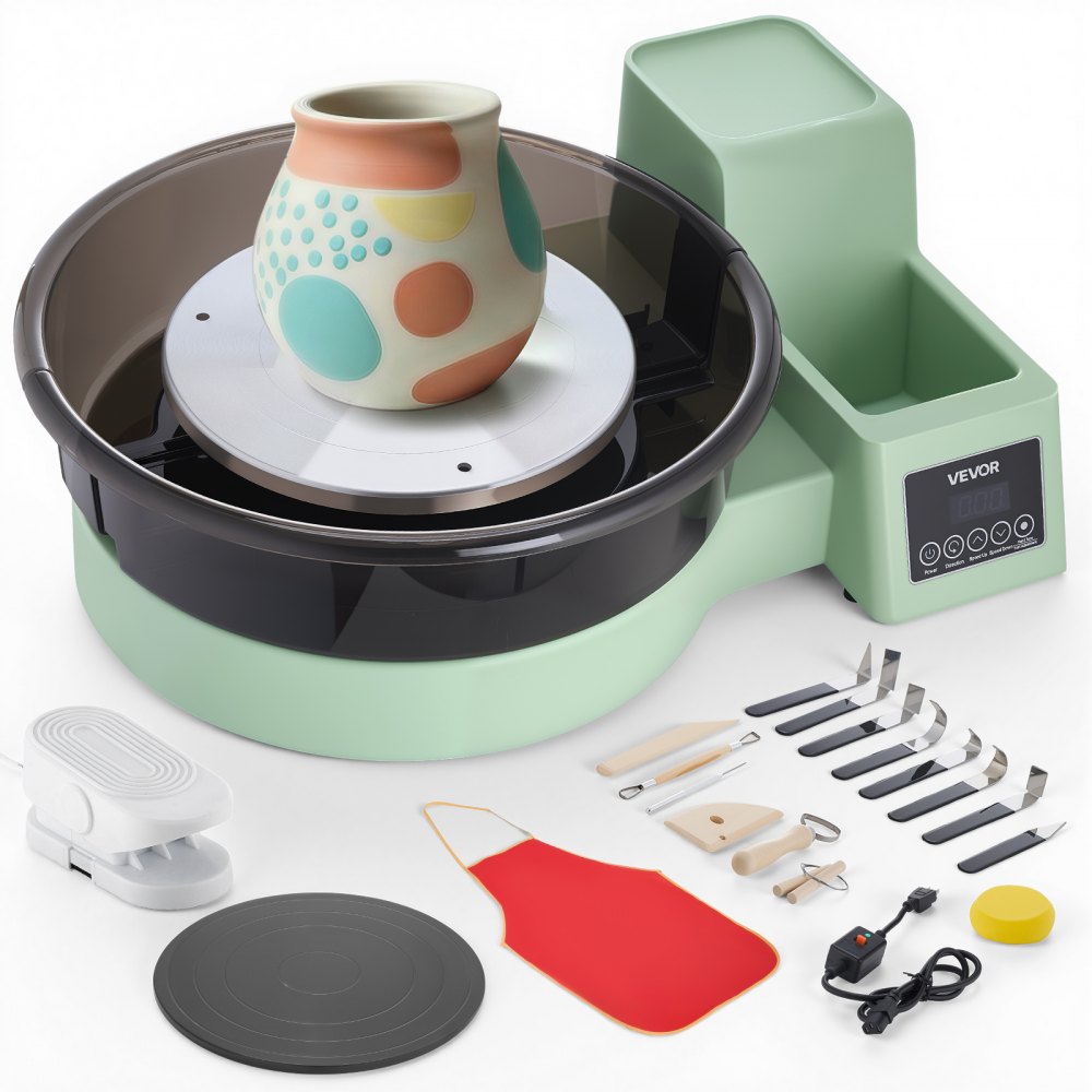 Koło garncarskie elektryczne VEVOR 450 W, talerz obrotowy 28/36 cm, maszyna garncarska z pedałem nożnym i regulowaną prędkością 30-300 obr./min oraz skrzynką narzędziową, idealne dla początkujących do samodzielnego tworzenia glinianych modeli, kolor zielony - Sprzęt do przygotowywania żywności | Galaxy Sklep