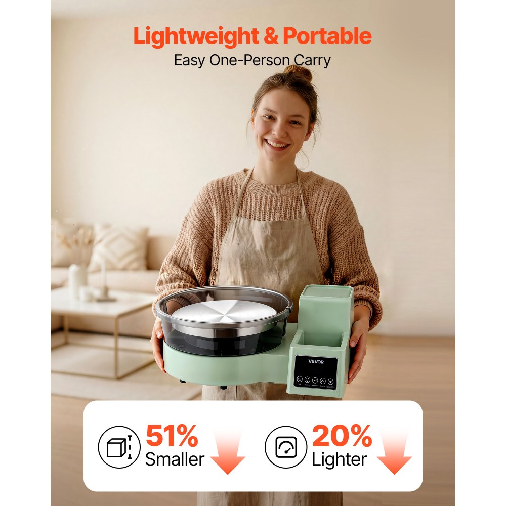 Oszczędność miejsca: Nasze elektryczne koło garncarskie zostało zaprojektowane tak, aby maksymalnie wykorzystać przestrzeń do kreatywnej pracy. Innowacyjny blat jest o 50% mniejszy niż w tradycyjnych modelach, co pozwala zaoszczędzić miejsce w domu i ułatwia transport i przechowywanie.