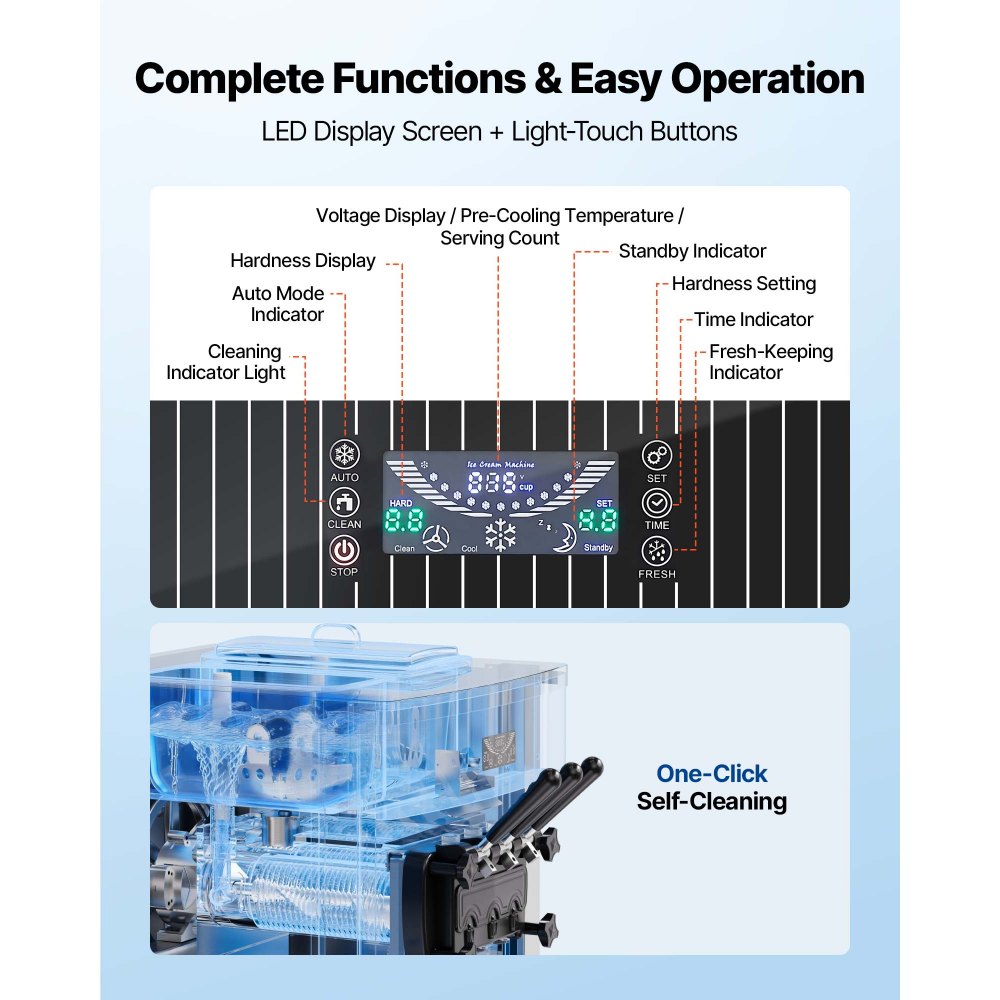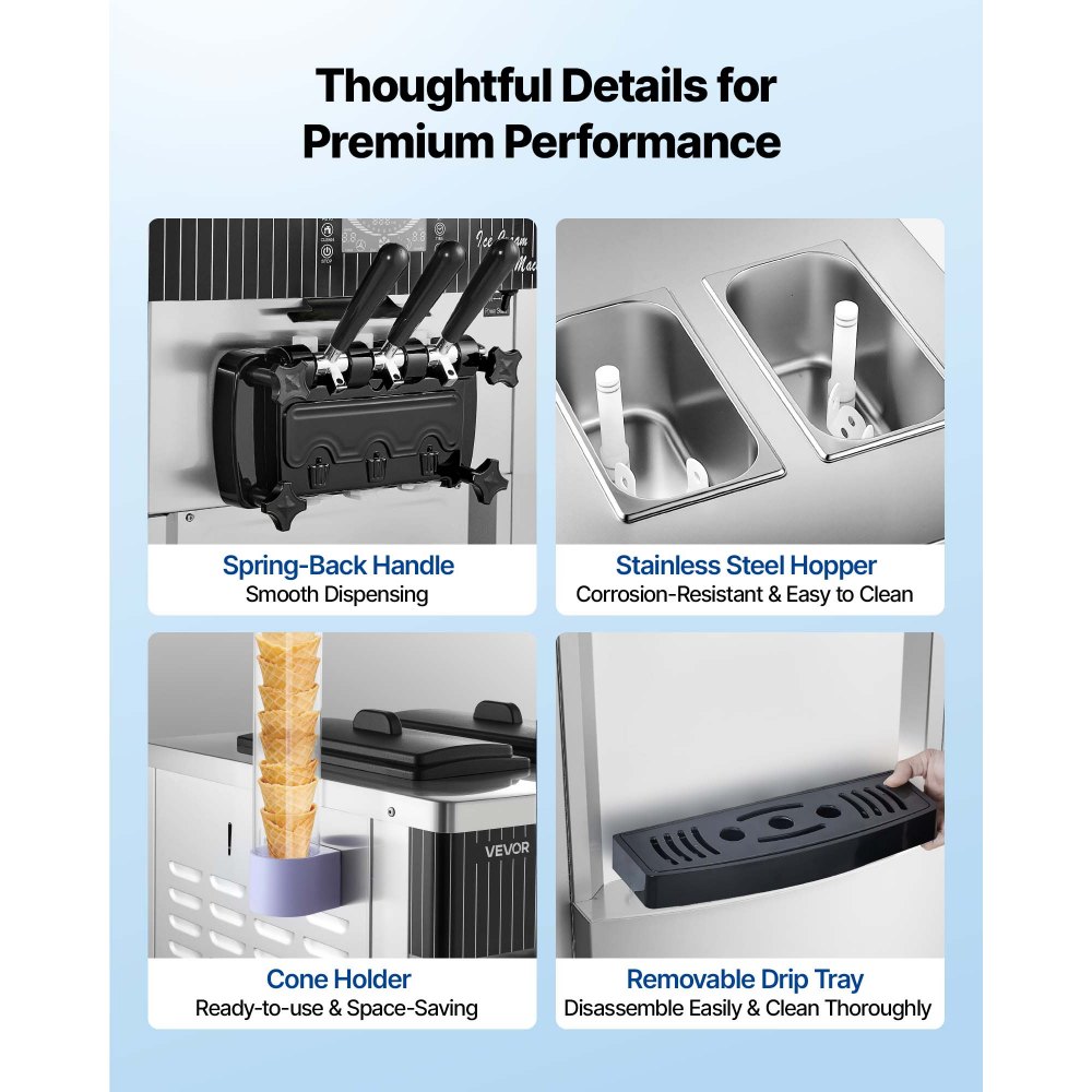 Wstępne schładzanie dla optymalnej świeżości: Ta wolnostojąca maszyna do lodów produkuje do 20–28 litrów na godzinę i nieprzerwanie dostarcza 8–12 porcji. System wstępnego schładzania schładza mieszankę do maksymalnej temperatury 12°C (53,6°F), pomagając zachować świeżość i zmniejszając ryzyko zepsucia, nawet w wysokich temperaturach otoczenia lub podczas przechowywania przez noc.