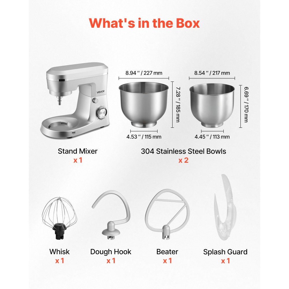 Mikser stojący/urządzenie kuchenne do pieczenia VEVOR, mikser do ciasta o mocy 1500 W ze stalowymi misami (4,2 + 5,7 l) oraz hakiem do ciasta, mieszadłem i trzepaczką, 10-biegowy regulowany mikser z funkcją pochylania - Sprzęt do przygotowywania żywności | Galaxy Sklep