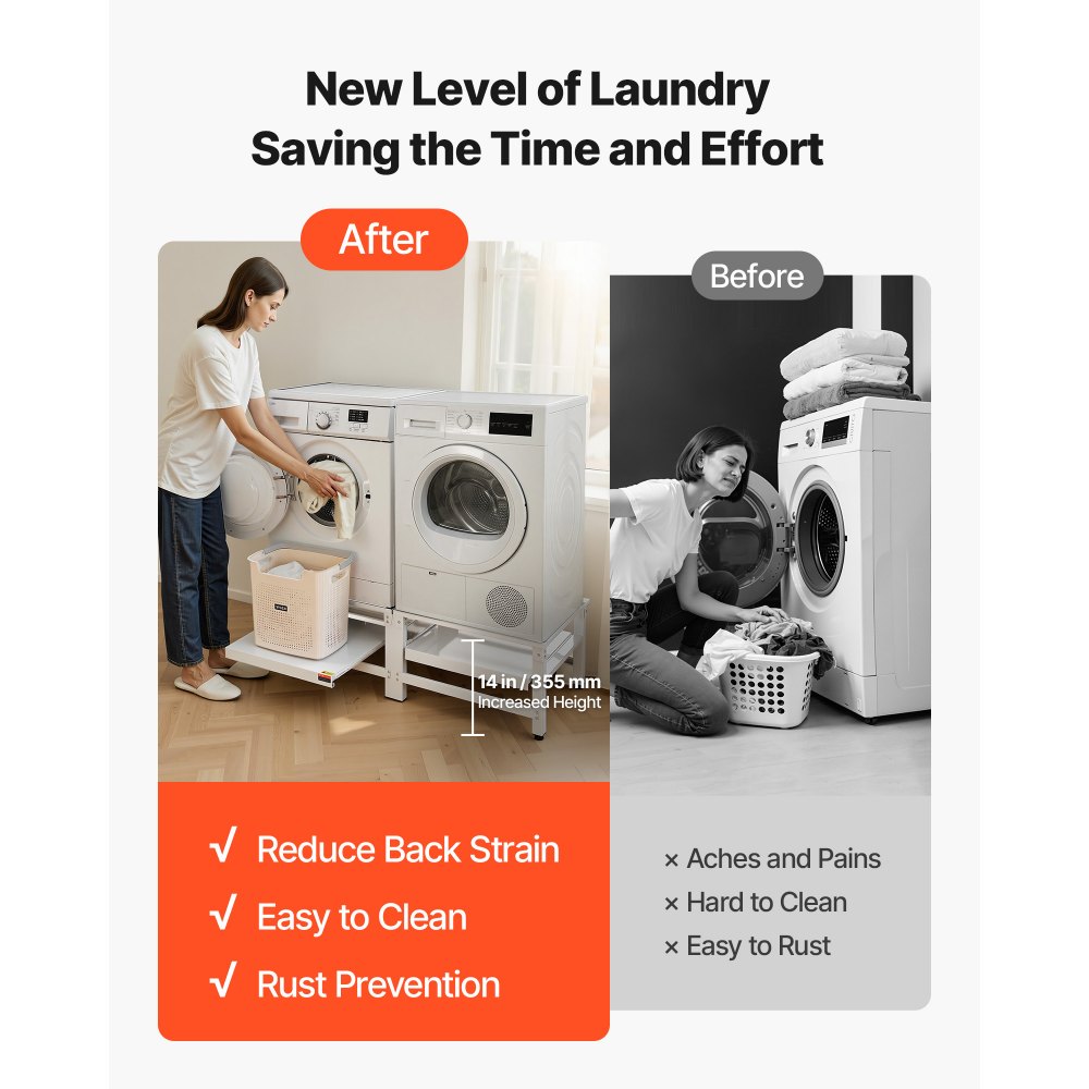 Ergonomiczna konstrukcja: Dzięki optymalnej wysokości podnoszenia 355 mm (14 cali), ten cokół do pralek i suszarek zmniejsza obciążenie pleców i kolan podczas schylania się. Dzięki temu pranie jest znacznie wygodniejsze dla osób starszych i osób o ograniczonej sprawności ruchowej.