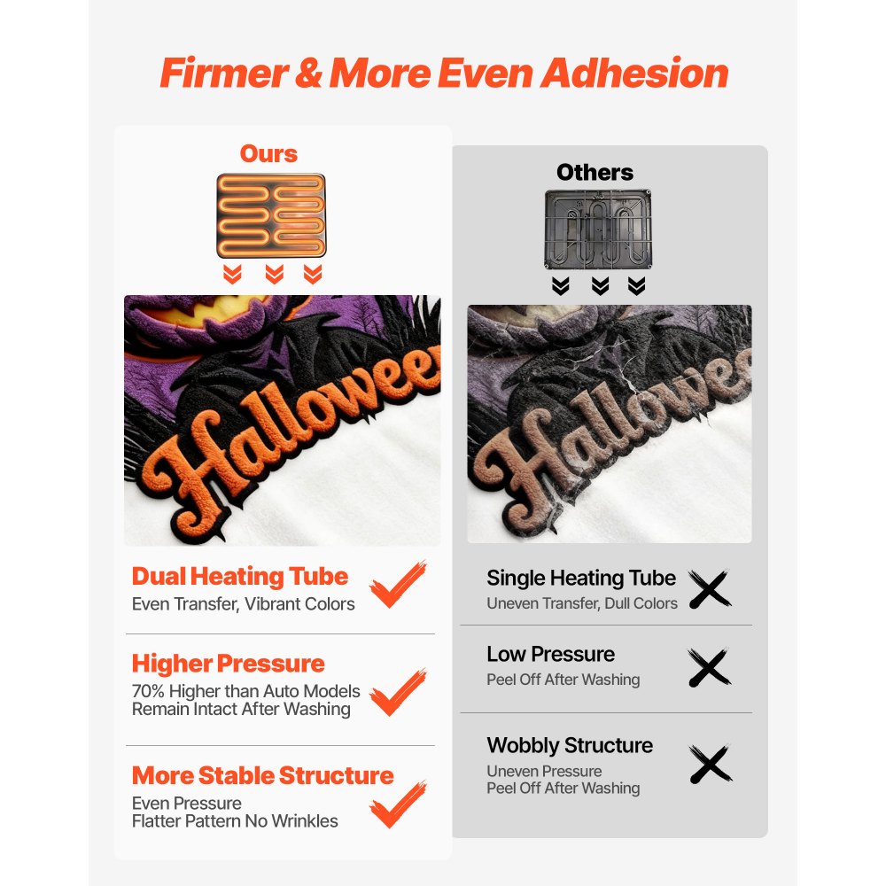 Doskonałe prasowanie termiczne: Prasa termiczna o wymiarach 15 x 15 cali (38 x 38 cm) oferuje o 70% większy nacisk niż modele automatyczne, przewyższając nawet modele konwencjonalne. Nowa, niezwykle stabilna konstrukcja zapewnia równomierny rozkład nacisku, co przekłada się na doskonałe rezultaty i wyraźniejsze, trwalsze wzory.