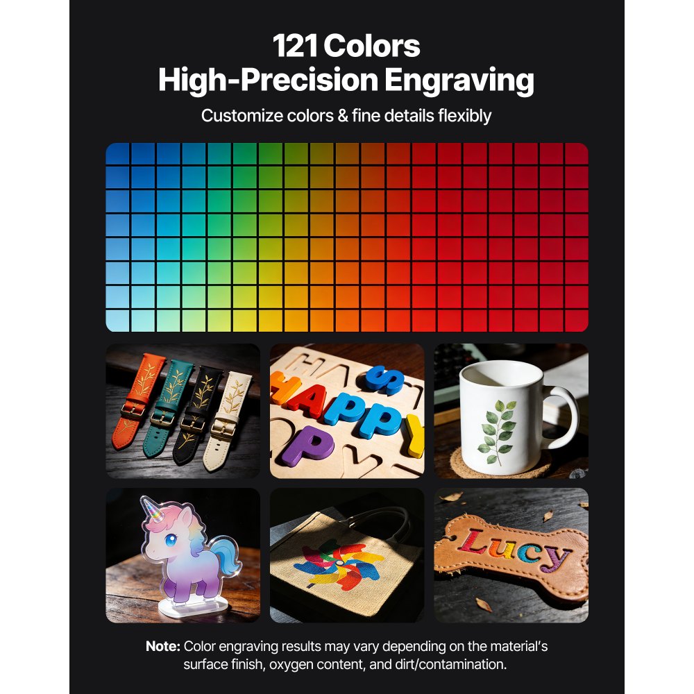 Inteligentne grawerowanie kolorami: Ta przenośna grawerka oferuje ponad 121 opcji kolorystycznych i precyzyjną technologię laserową, zapewniającą olśniewające kolory w grawerunkach. Umożliwia precyzyjne odwzorowanie milionów odcieni kolorów.