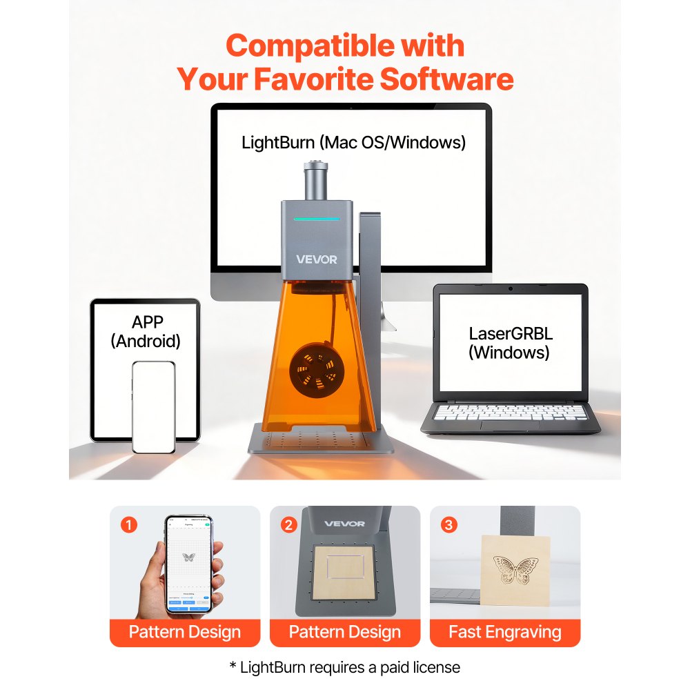 Łatwa obsługa: Nasz przenośny grawer laserowy z regulowanym kątem nachylenia nadaje się zarówno do użytku ręcznego, jak i stacjonarnego. Kompatybilny z LaserGRBL (Windows), LightBurn (Windows i macOS) oraz aplikacją mobilną (Android) z połączeniem Wi-Fi.
