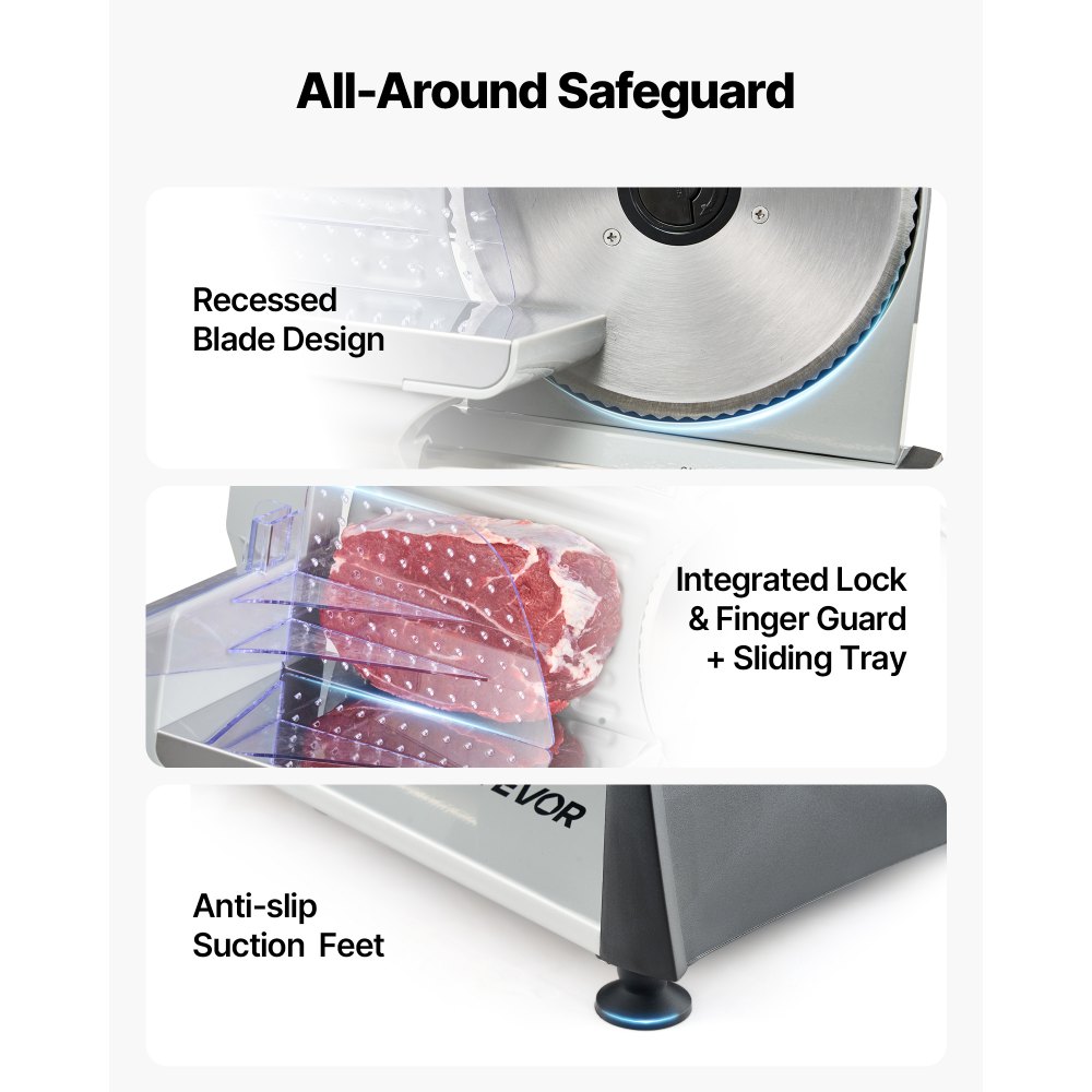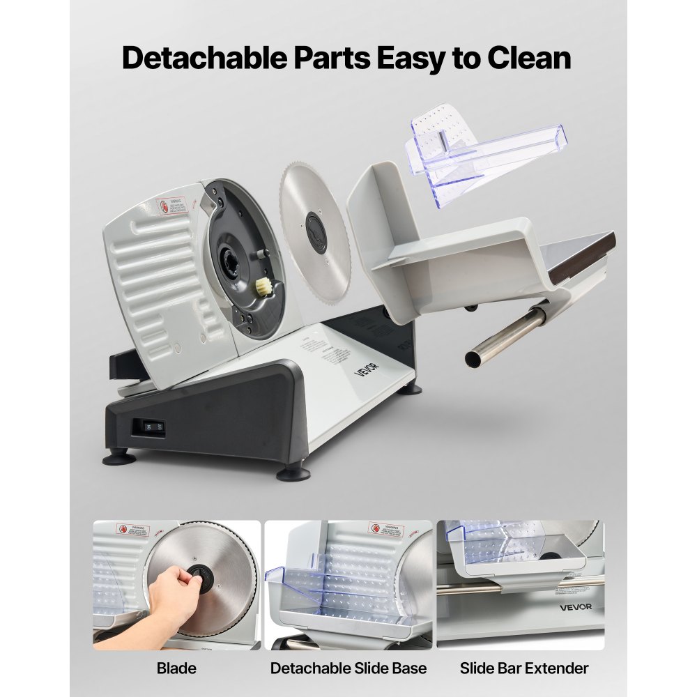 Wydajne krojenie mięsa: Ta wysokiej jakości krajalnica do mięsa jest wyposażona w trwałe, ostre ostrze o długości 7,5 cala (19 cm) i jest napędzana silnikiem o mocy 200 W. Prędkość cięcia od 70 do 100 obr./min zapewnia gładkie, równomierne krojenie bez zacięć.
