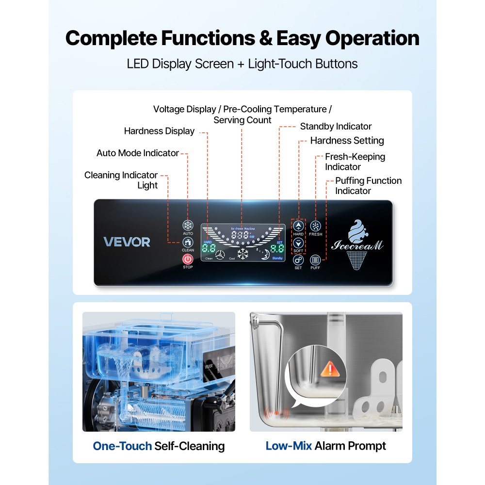Wstępne schładzanie dla optymalnej świeżości: Ta wolnostojąca maszyna do lodów produkuje do 20–28 litrów na godzinę i nieprzerwanie dostarcza 8–12 porcji. System wstępnego schładzania schładza mieszankę do maksymalnej temperatury 12°C (53,6°F), zapewniając długotrwałą świeżość i zapobiegając psuciu się produktu, nawet w wysokich temperaturach otoczenia lub podczas przechowywania przez noc.