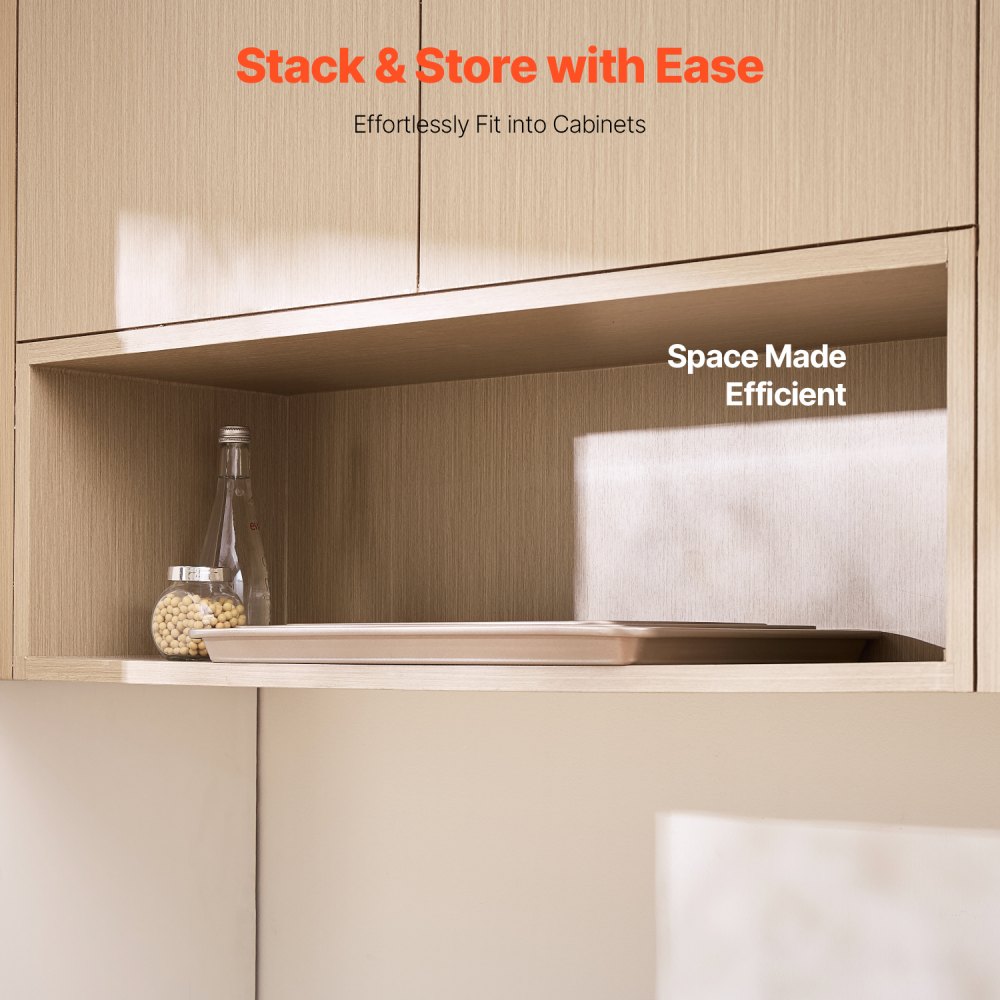 Niezwykła odporność na ciepło: Te wytrzymałe blachy do pieczenia wykonane są z wysokiej jakości stali węglowej o grubości 0,8 mm – dwukrotnie grubszej niż tradycyjne blachy do pieczenia – zapewniając stabilność, równomierne rozprowadzanie ciepła i lata niezawodnego użytkowania. Zaprojektowano je tak, aby były odporne na odkształcanie i łuszczenie, nawet w wysokich temperaturach do 232°C (450°F), gwarantując idealne rezultaty pieczenia za każdym razem.