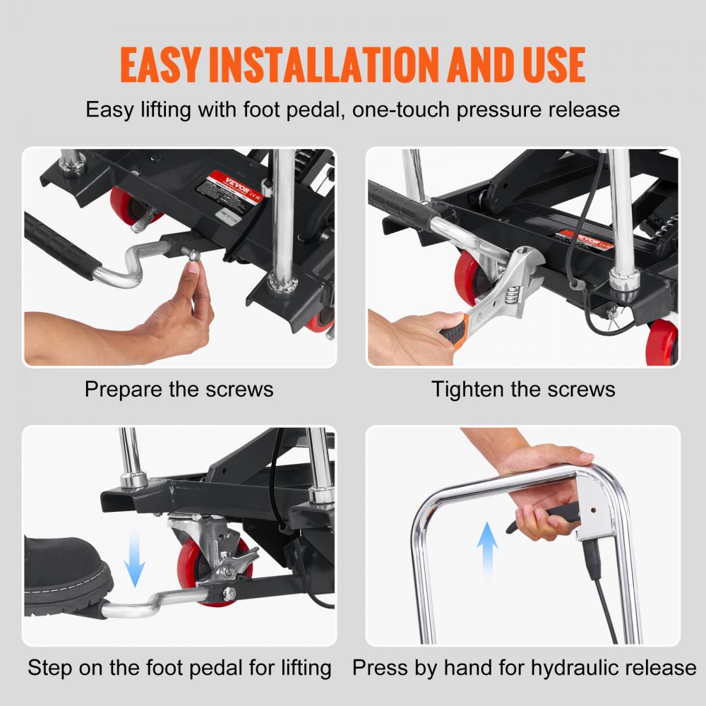 Udźwig 227 kg: Podejmuj się różnorodnych zadań podnoszenia z pewnością siebie! Nasz czarny hydrauliczny podnośnik nożycowy został zaprojektowany do podnoszenia ładunków o wadze do 227 kg. Nożyce i platforma wykonane są z wysokiej jakości, pogrubionej stali z odporną na rdzę powłoką proszkową. Zapewnia to długotrwałą trwałość i stabilność podczas podnoszenia ciężkich przedmiotów, dzięki czemu praca jest łatwa, wydajna i bezpieczna.