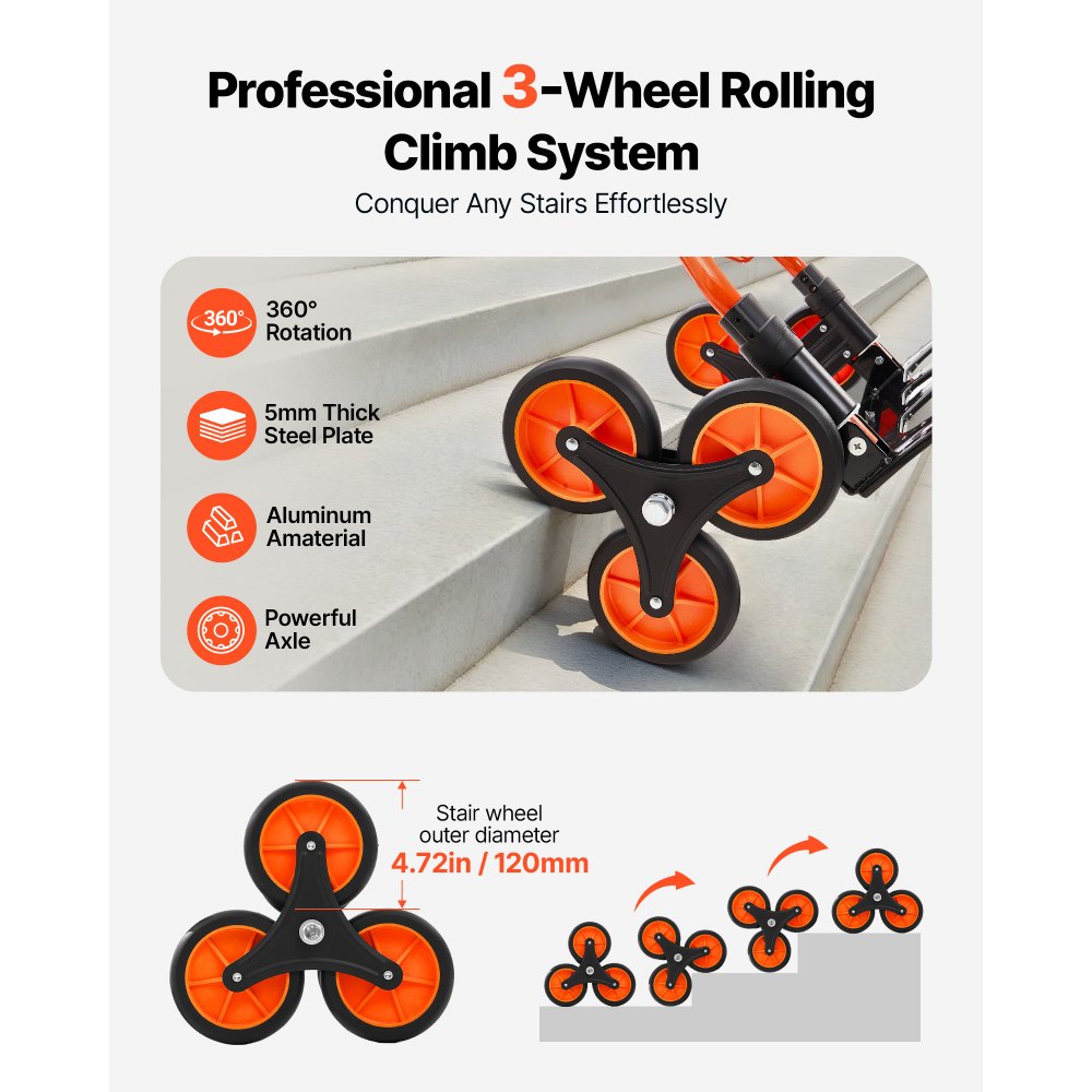Efektywna konstrukcja schodów: Ten schodołaz wyposażony jest w trzykołowy system z wytrzymałymi kołami z tworzywa TPR i polipropylenu. Zapewnia niezawodne podparcie i płynne toczenie, dzięki czemu wchodzenie po schodach jest łatwiejsze i mniej męczące.