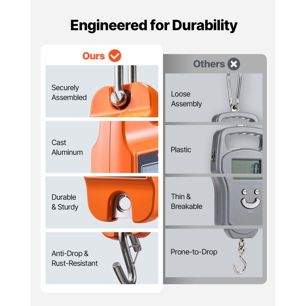 Wytrzymała i bezpieczna: Obudowa naszej wagi wiszącej, wykonana z odlewanego ciśnieniowo aluminium, jest lekka, a jednocześnie wytrzymała. Uchwyt ze stali nierdzewnej i antypoślizgowy hak w kształcie litery S zapobiegają odkształceniom i przypadkowemu wyjęciu, zapewniając bezpieczne podnoszenie.