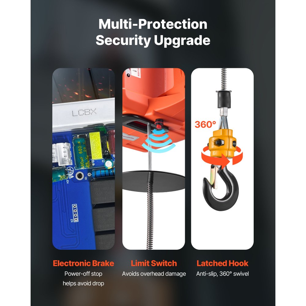 Wielostopniowe zabezpieczenie: Ta elektryczna wciągarka łączy w sobie hamulce elektroniczne i mechaniczne, zapewniając bezpieczne zatrzymanie. Wyłącznik krańcowy i hak bezpieczeństwa 360° zwiększają bezpieczeństwo, a silnik zatrzymuje się automatycznie w przypadku awarii zasilania lub osiągnięcia górnej granicy, zapobiegając upadkowi.