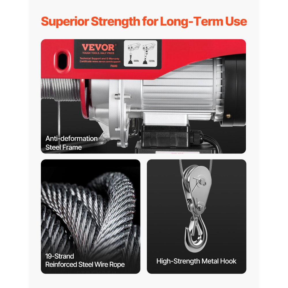 Wciągnik elektryczny VEVOR, 1320 funtów, 230 V, elektryczna wciągarka linowa z bezprzewodowym sterowaniem o długości 328 stóp i 14 stóp, przewodowym pilotem zdalnego sterowania, wysokość podnoszenia 40 stóp, pojedynczy kabel, pojedyncze/podwójne zawiesia, wciągnik do garażu, magazynu, fabryki - Sprzęt dźwigowy i wyciągarki | Galaxy Sklep