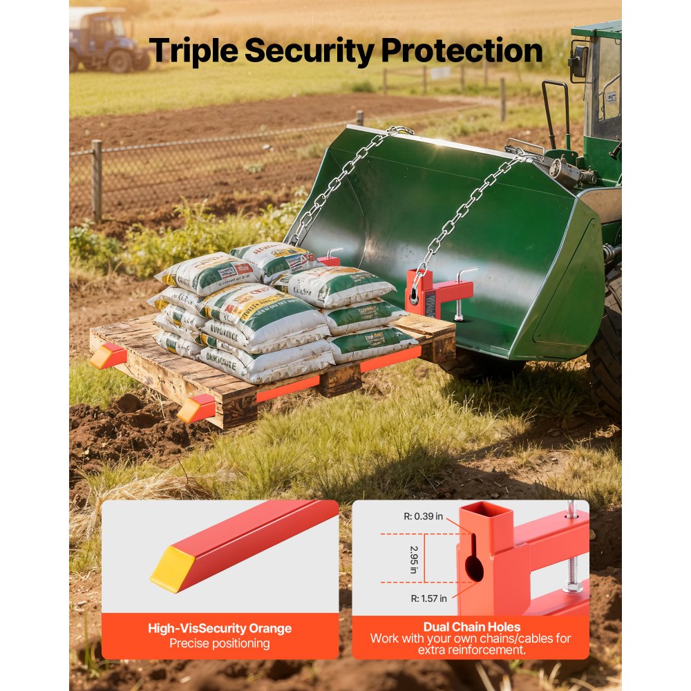 Szczegóły dotyczące jakości: Podwójne otwory na łańcuchy w naszych widłach paletowych umożliwiają zastosowanie dodatkowych pasów mocujących dla zwiększenia stabilności, a jaskrawopomarańczowe końcówki poprawiają widoczność w trudnym terenie. Dzięki temu uzyskasz bezpieczniejsze ustawienie i płynniejszą obsługę za każdym razem.