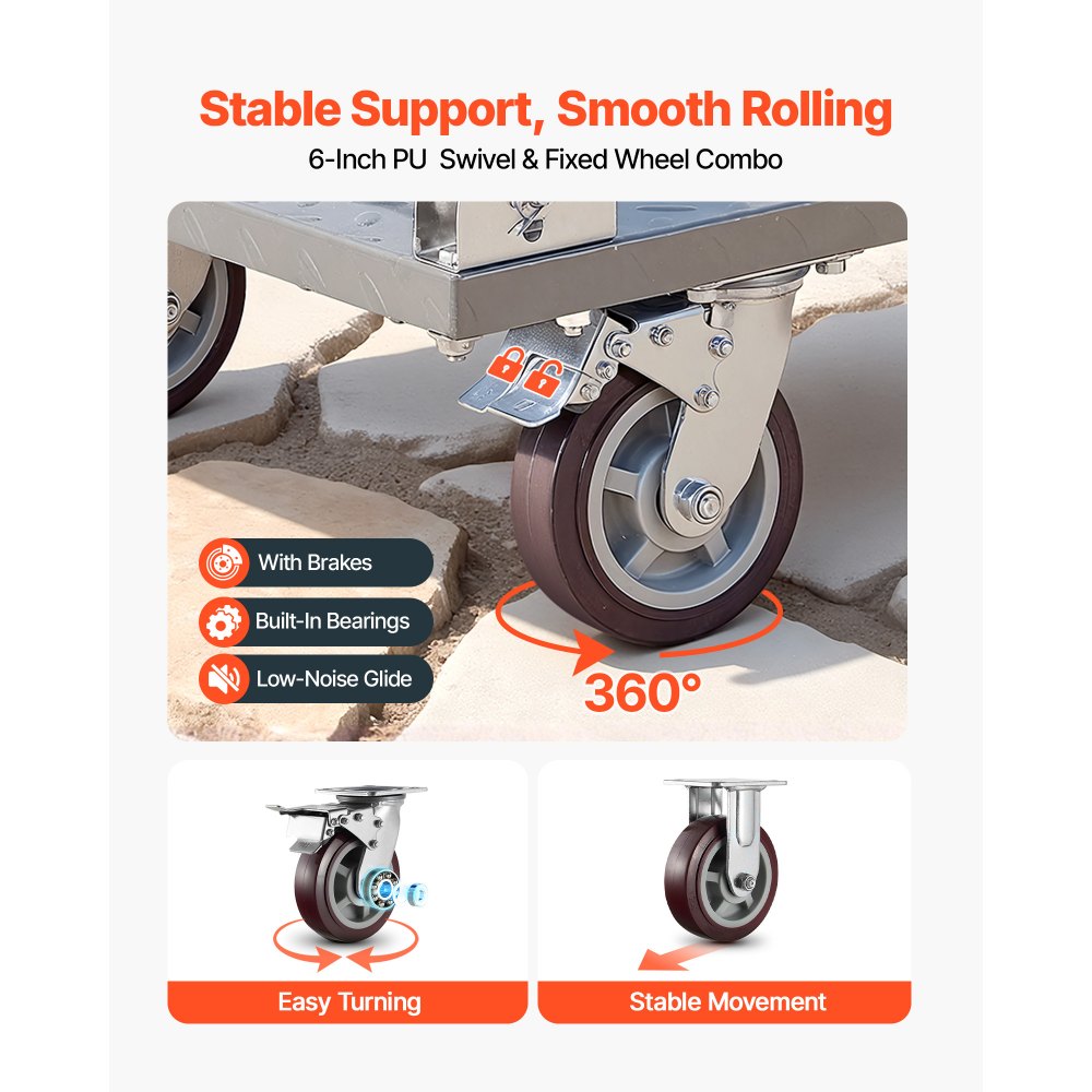 Wytrzymałe koła z pełnej gumy: Wyposażone w cztery koła poliuretanowe o średnicy 152 mm (6 cali) – dwa obrotowe z hamulcami nożnymi i dwa stałe. Ten składany wózek transportowy oferuje mobilność w zakresie 360° i cichą, odporną na przebicia pracę. Hamulce zapewniają bezpieczne pozycjonowanie.