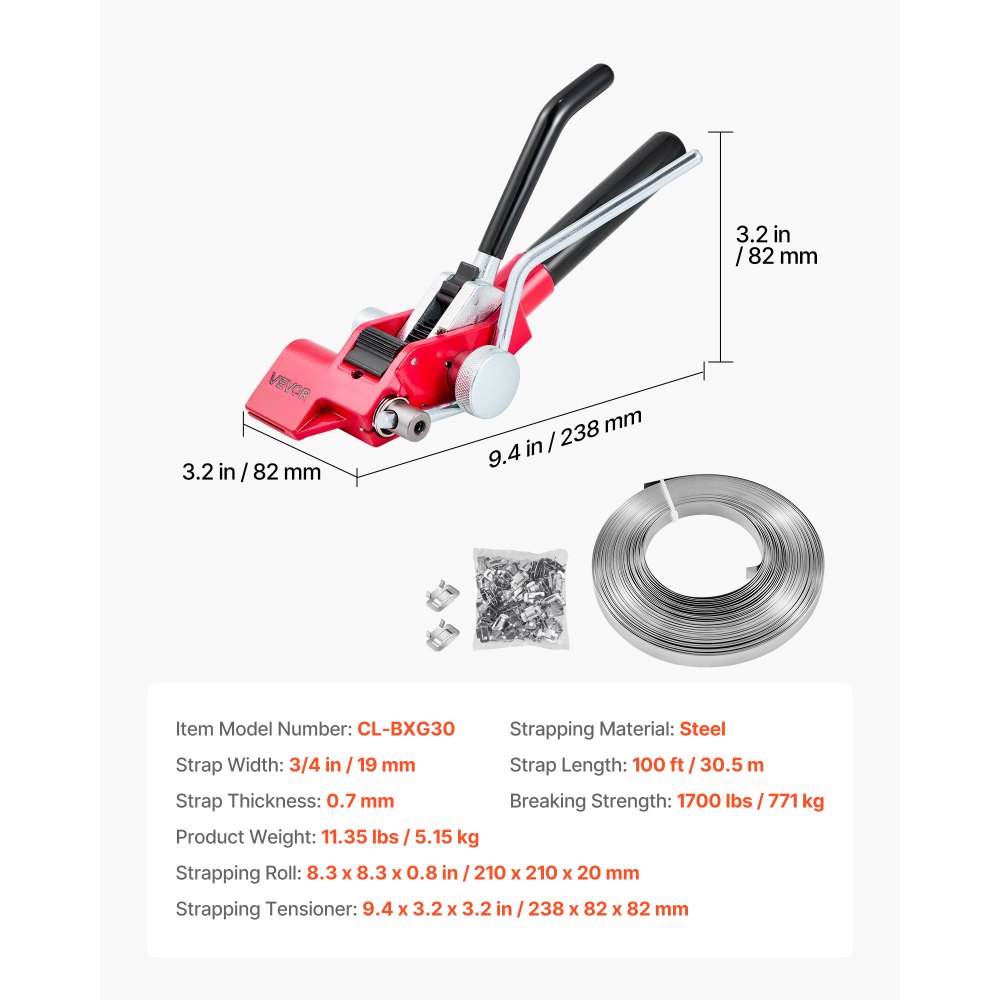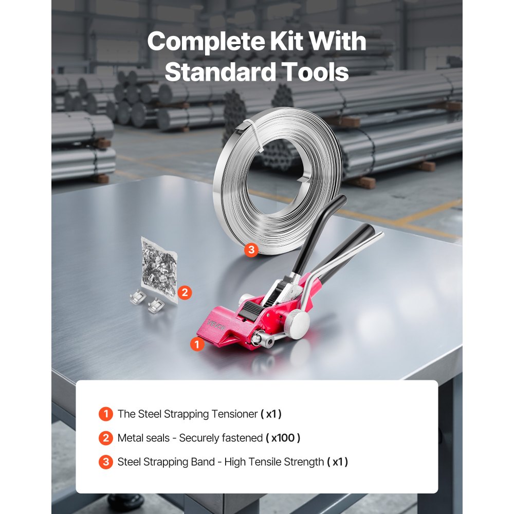 Zestaw do spinania taśmą stalową VEVOR, 3-częściowy, ręczne narzędzie do spinania taśmą metalową o długości 30,5 m, 100 metalowych klipsów i obcinak, idealne wyposażenie warsztatu do pakowania, transportu i magazynowania przemysłowego - Sprzęt dźwigowy i wyciągarki | Galaxy Sklep