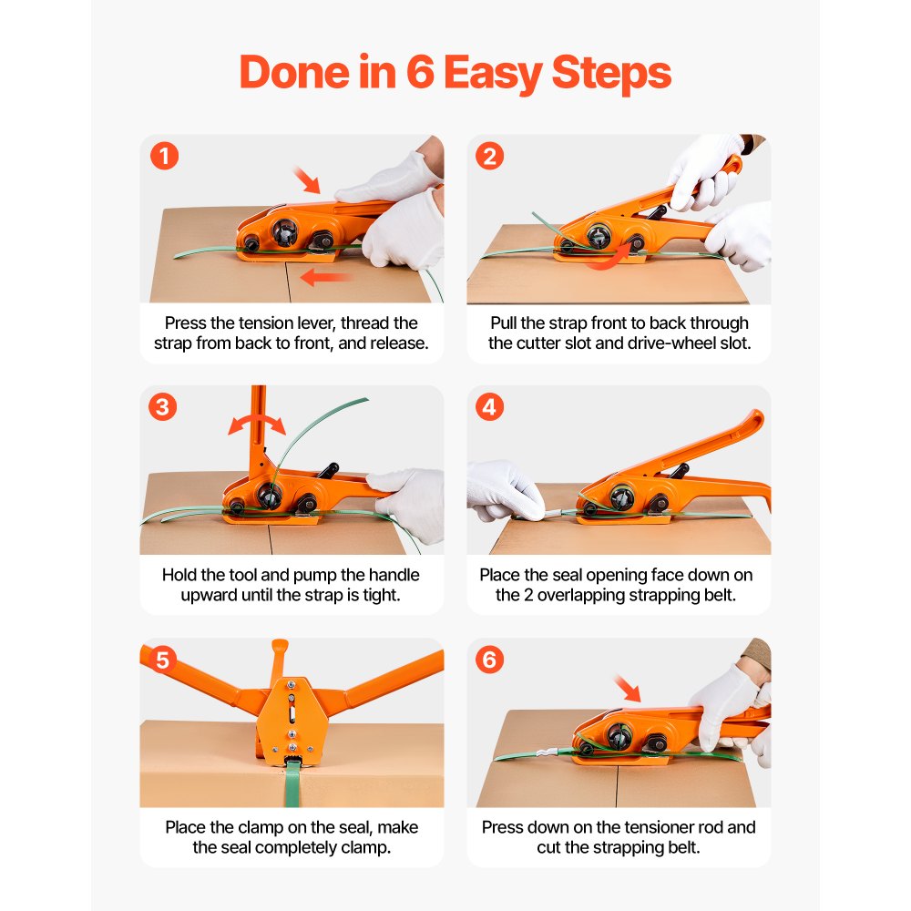 Ręczne narzędzie do spinania: Ten wytrzymały zestaw do ręcznego spinania jest wyposażony w przedłużony uchwyt. Zwiększa siłę spinania dzięki łatwej obsłudze dźwignią i nadaje się do taśm poliestrowych (PET) o szerokości 15,9 mm.