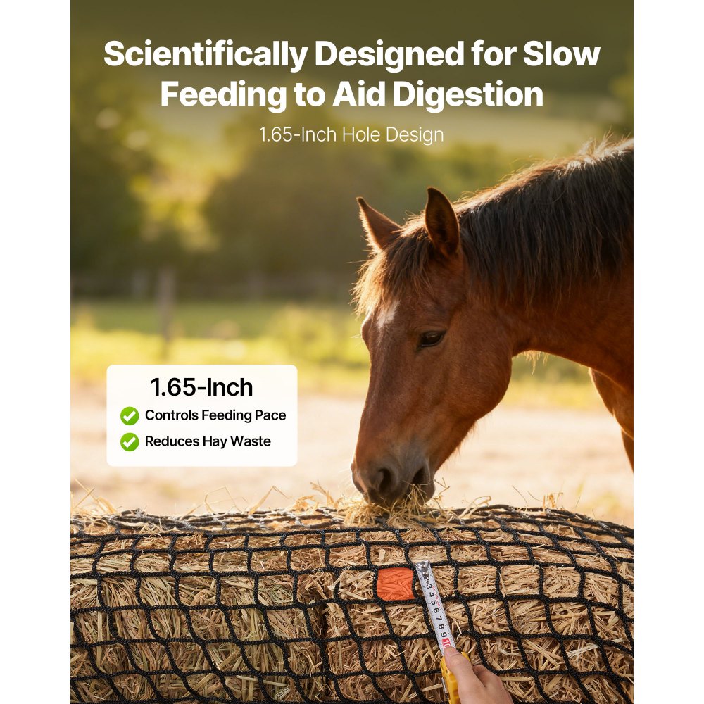 Zoptymalizowane naukowo, powolne pobieranie: Ta okrągła siatka do siana o oczkach 42 mm (1,65 cala) imituje naturalny wypas, spowalnia pobieranie paszy, zapobiega przekarmianiu i zmniejsza ryzyko wzdęć i wrzodów żołądka. Sprzyja to optymalnemu trawieniu u koni.