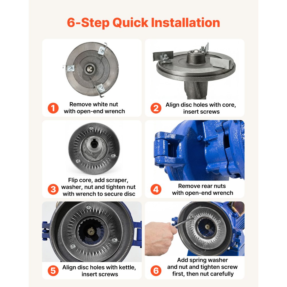 Wszechstronne mielenie na sucho: 2-częściowy zestaw tarcz mielących VEVOR do elektrycznych młynków zbożowych idealnie nadaje się do mielenia na sucho ziaren, pszenicy, kukurydzy, ziaren kawy oraz przypraw, takich jak pieprz, cynamon i koper włoski. Twarde składniki należy wcześniej zgnieść. Nie nadaje się do mielenia materiałów wilgotnych, świeżych, oleistych ani lepkich.