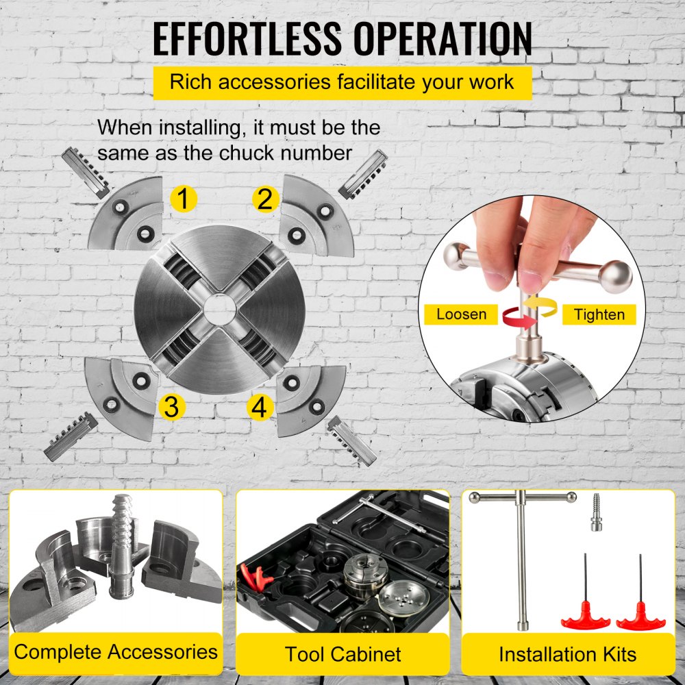 Łatwa obsługa: Uchwyt tokarski posiada funkcję automatycznego centrowania, dzięki czemu nie trzeba go wielokrotnie kalibrować podczas montażu. Ten kompletny zestaw uchwytów tokarskich zawiera dwa zestawy szczęk i jeden zestaw narzędzi montażowych, które zapewniają dużą wygodę pracy i oszczędzają więcej czasu.