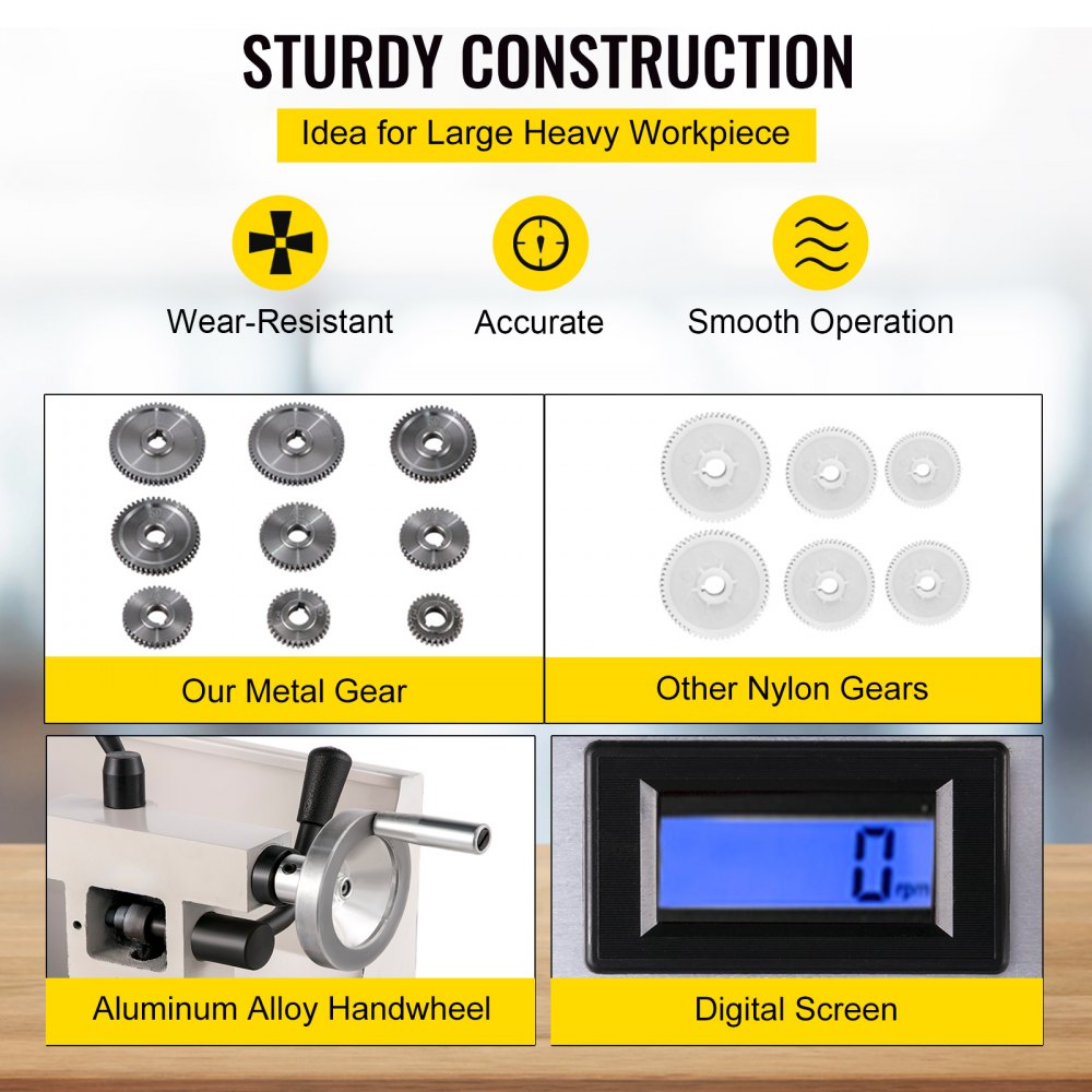Solidna i trwała konstrukcja: Mini tokarka wykonana jest z wysokiej jakości żeliwa i jest wyjątkowo odporna na zużycie. Wyposażona jest w silnik o mocy 600 W, który zapewnia dużą moc. Jeśli lubisz modelarstwo, będzie Twoim profesjonalnym pomocnikiem. Posiada precyzyjną podziałkę metryczną i metalowe koła zębate, co zapewnia jej wyjątkową precyzję.