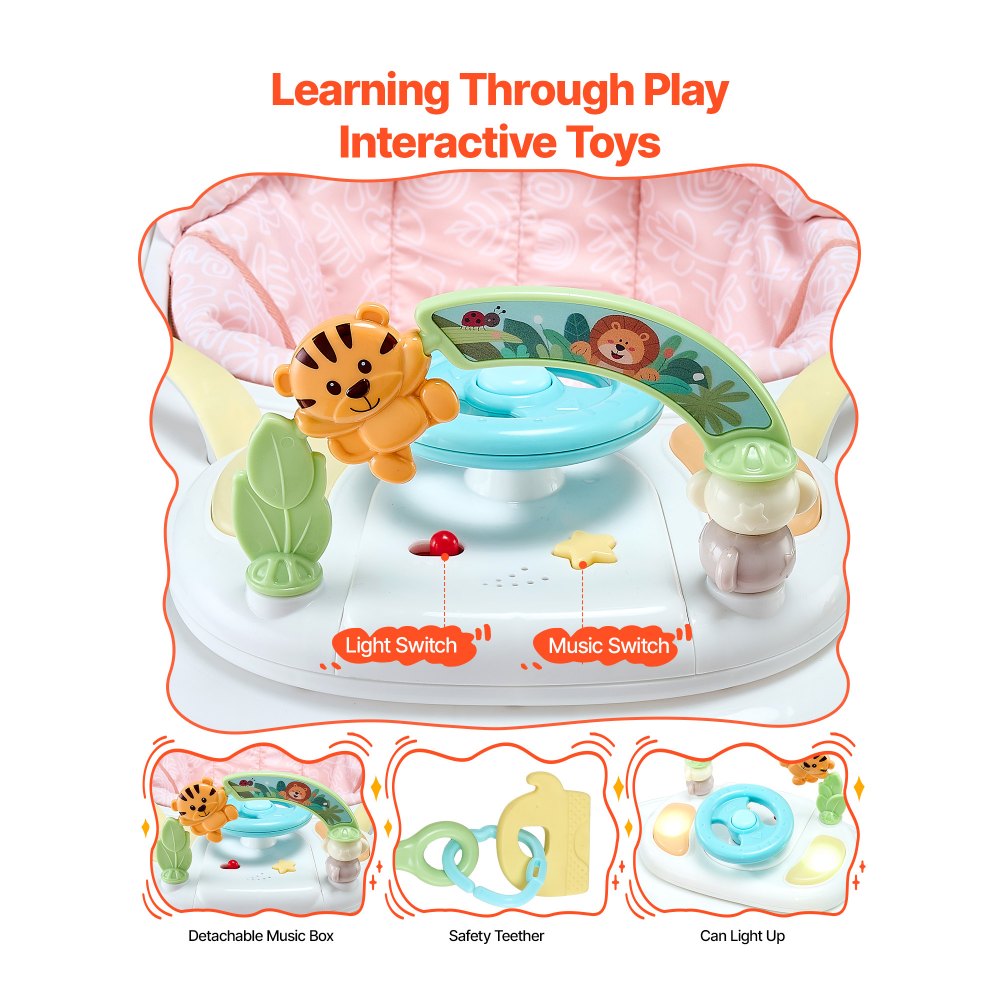 Interaktywna zabawka: Coś więcej niż chodzik dla dziecka – to wspaniałe centrum aktywności! Z odczepianą karuzelą muzyczną, która wspiera rozwój sensoryczny, a także wiatrakiem i gryzakami, które poprawiają koordynację wzrokowo-ruchową i wzmacniają mięśnie jamy ustnej.